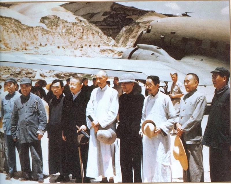1945年7月,毛泽东(右一)和周恩来(左一)等欢迎飞抵延安的国民参政会参政员黄炎培(右二)等六人
