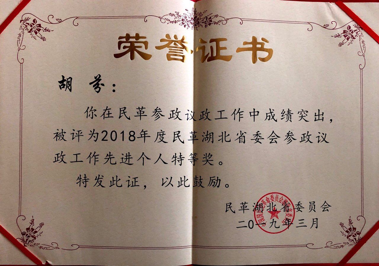 在本次会议中,我校民革党员胡芬同志被评为2018年度民革湖北省委会参政议政工作先进个人特等奖。