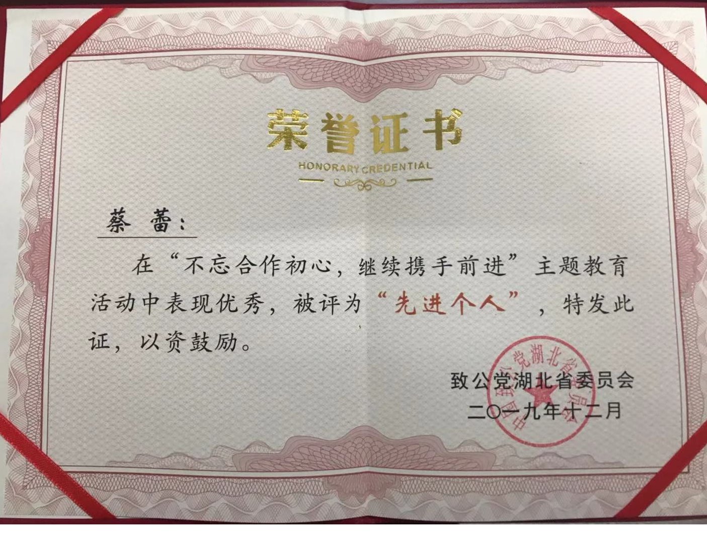 在本次会议中,湖北大学致公党党员蔡蕾荣获致公党省委“不忘合作初心,继续携手前进”主题教育“先进个人”。