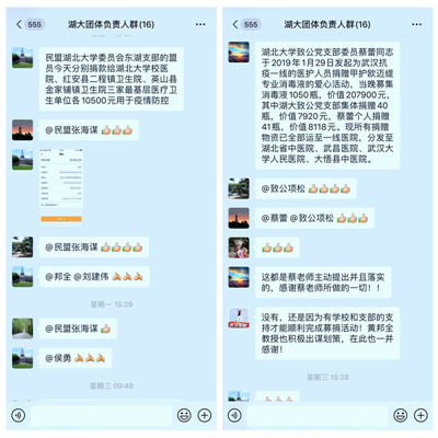 面对新冠肺炎疫情的肆虐,在民盟湖北大学委员会主委张海谋的联系下,民盟湖北大学委员会东湖支部用实际行动表明对抗击疫情的支持。从发出倡议到捐款截止24个小时内,支部主委杜敏,副主委林列、杨敏等10位盟员和1位入盟积极分子共捐出31500元抗击疫情专款。为保证捐赠专款能够高效直达到第一线,东湖支部选择了三家综合力量较为薄弱的社区医院和乡镇卫生院进行定向捐赠。2月3日上午,东湖支部将专款分别汇至湖北大学校医院、革命老区红安县二程镇卫生院和大别山深度贫困县英山县金家铺镇卫生院,每家基层单位各获得捐款10500元。