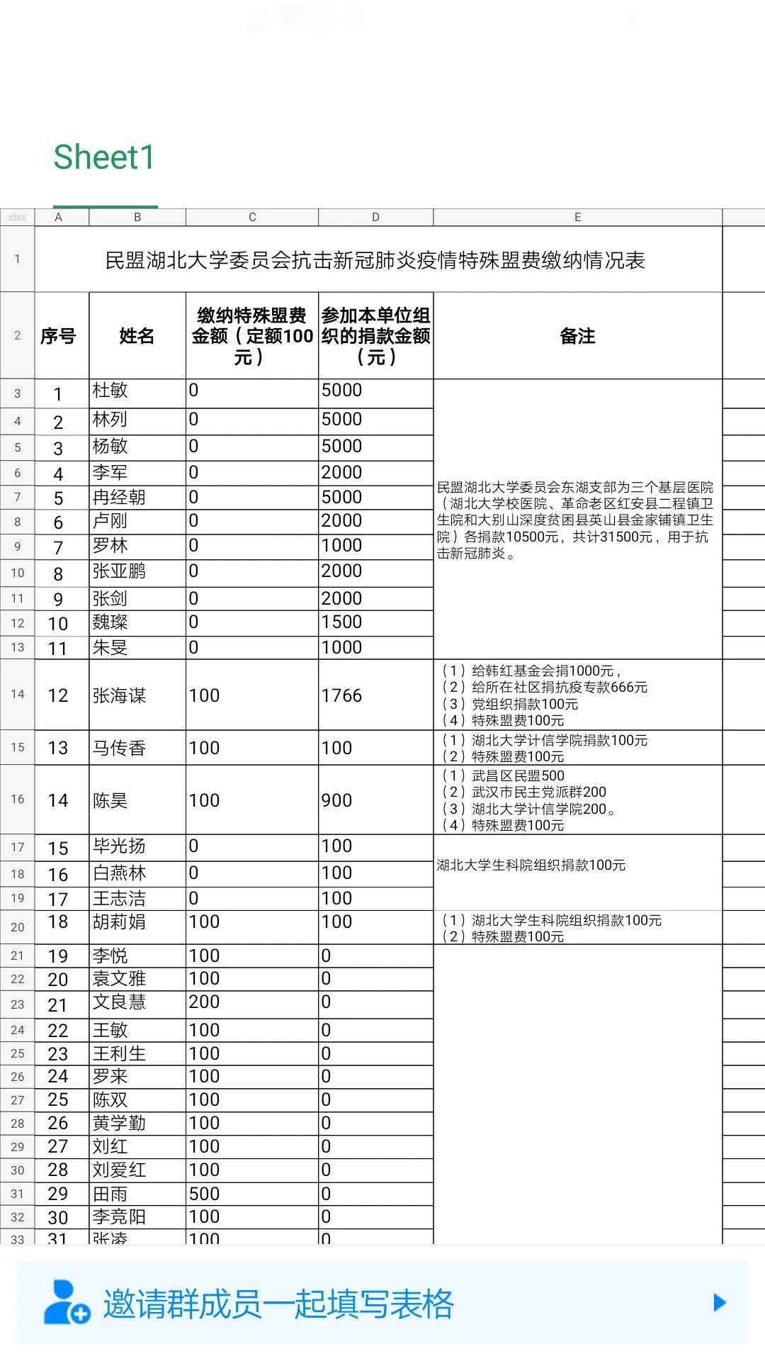 新冠肺炎疫情发生后,民盟湖北大学委员会盟员一直十分关注,为疫情发展忧心不已。在收到爱心募捐活动的倡议后,民盟湖北大学委员会共收到盟员募捐款39466元用于抗击新冠肺炎疫情。