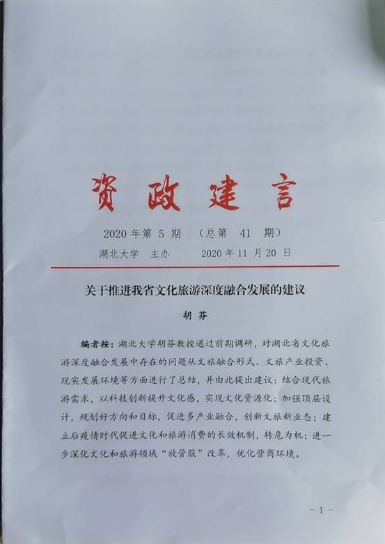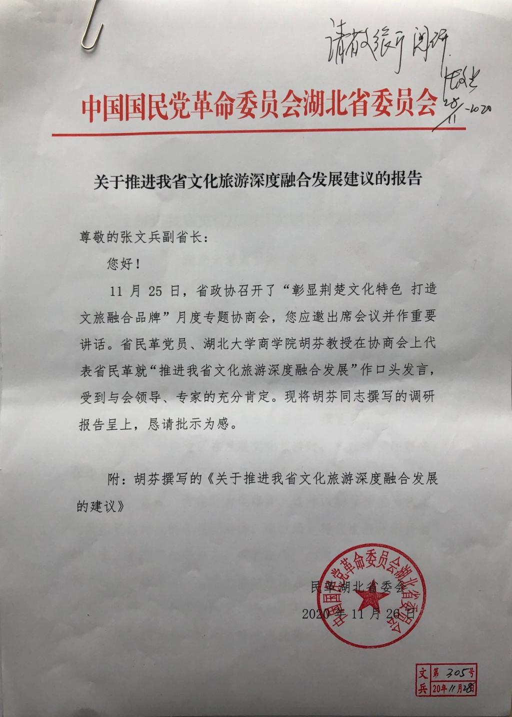我校胡芬教授代表民革省委会围绕促进文旅深度融合发展在协商上建言,个人撰写的《关于推进我省文化旅游深度融合发展的建议》获省领导批示。