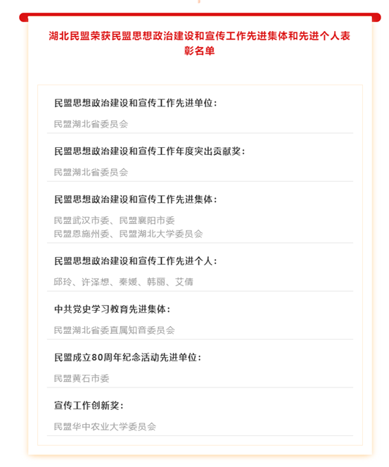 12月27日,民盟中央发布《民盟中央关于表彰思想政治建设和宣传工作先进的决定》,对在思想政治建设和宣传工作中取得突出成绩的集体和个人进行表彰,民盟湖北大学委员会思想政治建设和宣传工作得到了民盟中央的充分肯定,荣获“民盟思想政治建设和宣传工作先进单位”。