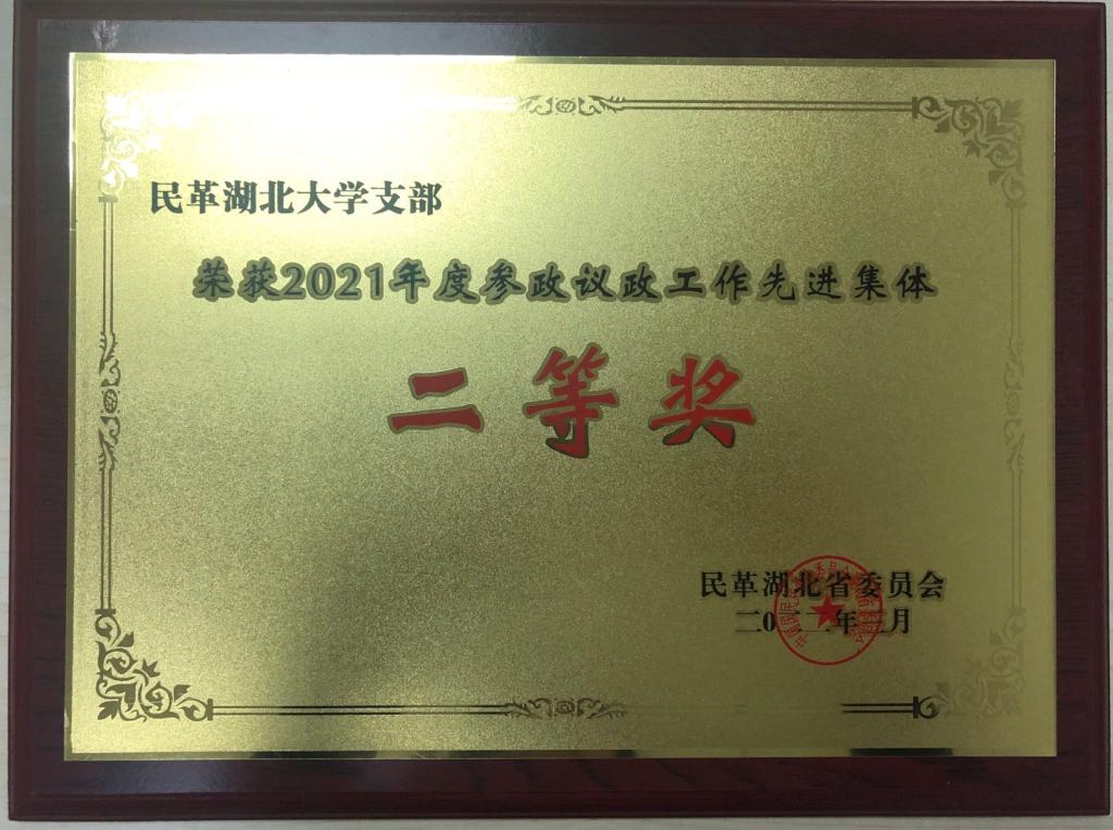 会上,民革湖北大学支部荣获“民革湖北省委2021年度参政议政先进集体二等奖”,民革湖北大学支部胡芬荣获“民革湖北省委2021年度参政议政先进个人”,胡芬、黄柏权荣获“2021年度反映社情民意信息工作先进个人”。此外,胡芬教授承接了民革湖北省委《新时代湖北历史文化名城名镇名村价值功能的挖掘、传承与创新研究》研究课题。