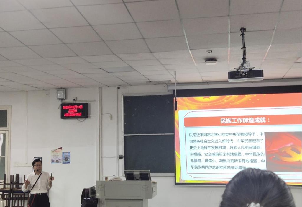 杨海军副教授以习近平总书记在党的十九大报告中的重要讲话为切入点,从“中华民族共同体”、“新时代铸牢中华民族共同体意识的行动指南”、“铸牢中华民族共同体意识”三方面向同学们深刻阐释了中华民族的基本情况、新时代铸牢中华民族共同体意识的具体内涵、重大意义、目标方法及行动指南。在授课过程中,他给同学们详细介绍了中央民族工作会议精神、在党的坚强领导下我国民族工作取得的辉煌成就、做好“铸牢中华民族共同体意识”的相关工作、高校要将“铸牢中华民族共同体意识”贯穿立德树人全过程,并引导同学们学习领悟从我国长期的民族工作实践中汲取的历史智慧。最后,勉励同学们作为新时代的新青年,应自觉学习马克思主义民族观和习近平总书记在中央民族工作会议上的讲话精神,铸牢中华民族共同体意识,维护民族团结,为实现中华民族伟大复兴的中国梦奉献青年力量。