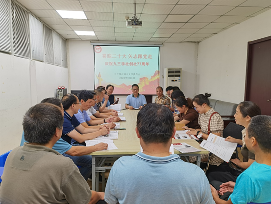 9月3日,九三学社湖北大学委员会在生命科学学院六楼会议室举行了“喜迎二十大,矢志跟党走暨庆祝九三学社创社77周年座谈会”。共有20名九三学社社员参会,会议由九三学社主委李圣纯主持。