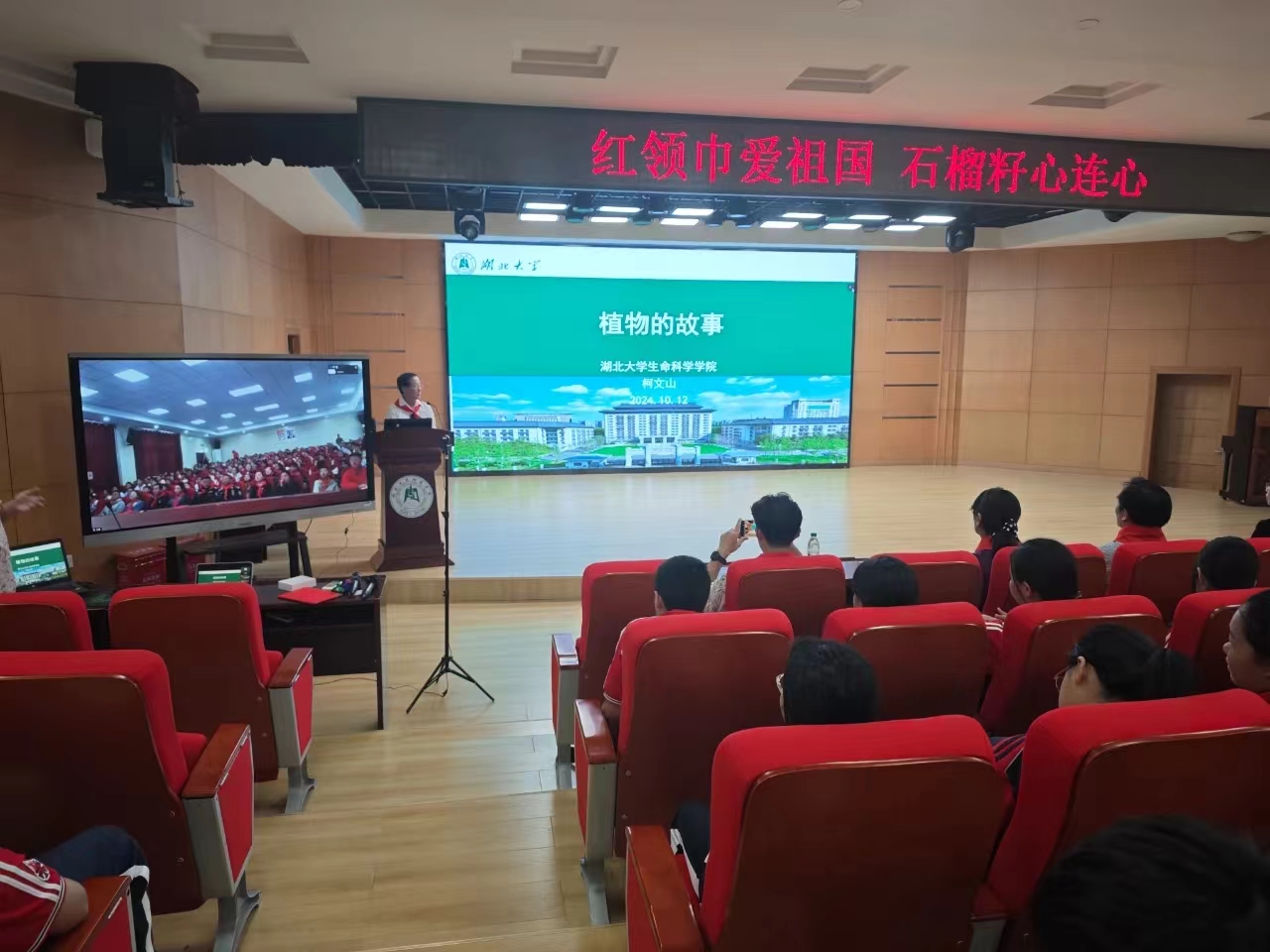 为贯彻落实党的二十届三中全会精神和习近平总书记关于少年儿童和少先队工作的重要论述,落实全国教育大会精神,10月12日,在中国少年先锋队建队75周年之际,西藏山南市东辉中学和湖北大学附属中学通过“云端”连线的方式联合开展“红领巾爱祖国·石榴籽心连心”少先队建队日主题教育活动。山南市东辉中学校长刘艳、副校长鲁芳蕾、梁杰、德教主任刘俊、团委副书记白玛德庆、山南市人民检察院未成年人检察部副主任达娃央宗、湖北大学第七批研究生赴藏支教团志愿者,湖北大学附属中学党总支书记陈卫东、副校长胡胜民、学工主任陶常荔、团委书记张悦目及家长代表与两校师生近500人参与了线上线下活动,活动由湖北大学第七批研究生赴藏支教团向辉主持。作为活动内容之一,民盟湖北大学委员会盟员、生命科学学院柯文山教授受邀为两校少先队员讲了一堂题为《植物的故事》的主题队课,同时也是一次生动的科普活动。