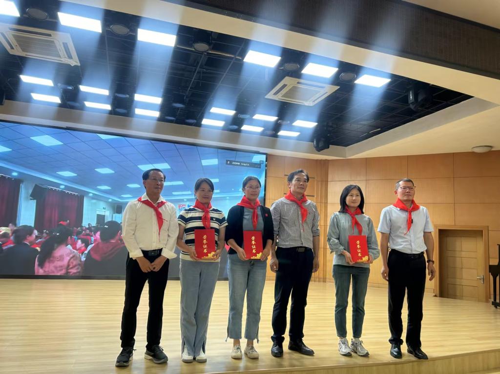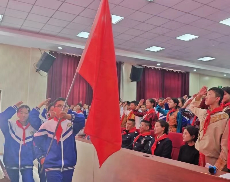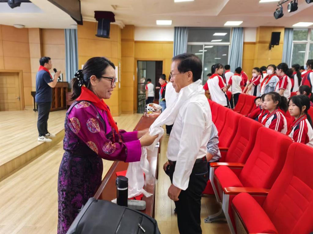 在少先队活动过程中,柯文山教授和湖大附中陈卫东书记等领导共同为先进少先队员授奖。西藏东辉中学团委副书记白玛德庆为柯文山教授敬献哈达,祝愿两校友谊长存。
