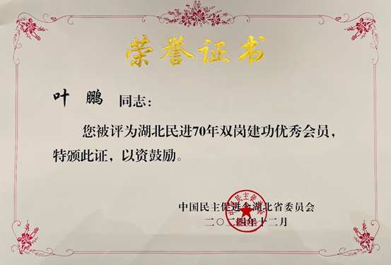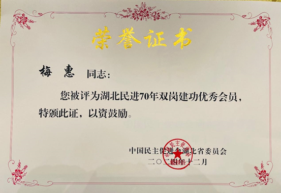 此次大会表彰了一批先进集体、优秀会员。民进湖北大学委员会荣获“先进集体”称号,委员会副主委叶鹏和会员梅惠荣获“双岗建功优秀会员”称号。